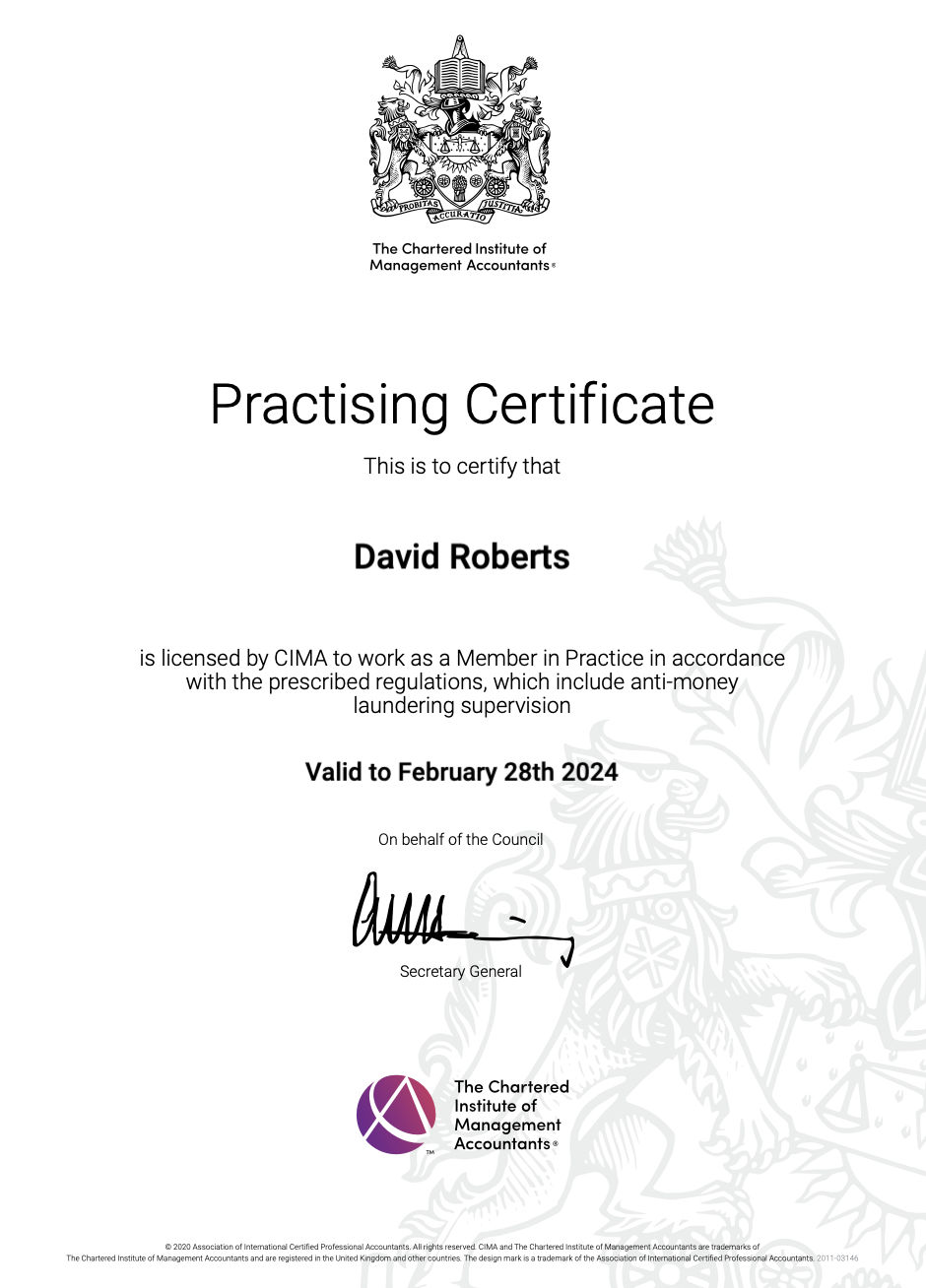 Huw is authorised in his full name of David Huw Roberts by the Chartered Institute of Management Accountants to work as a Member in Practice.